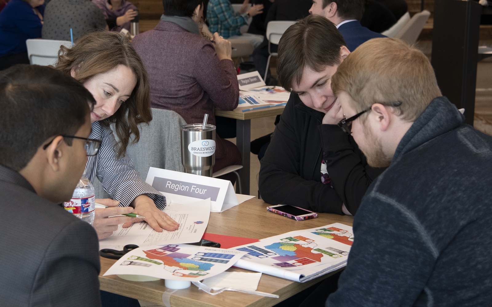 Ankit Sanghavi (left), A. Baldwin, Jessica Zweiner, and Danny Roe participate in a team-building activity at the Research Engagement Advisory Council kickoff meeting for the TransFORWARD project in November 2018.