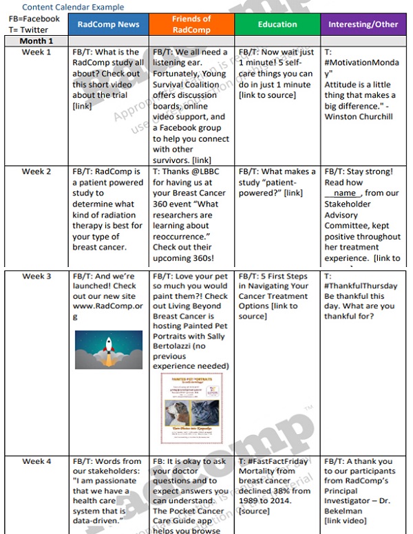 Because of the study’s duration, the research team needed to come up with creative ways to keep the study relevant. The team also needed ways to disseminate gentle, periodic reminders to study participants to fill out surveys. Dana Goodlett, MPH, MA, Research Engagement Officer at the University of Pennsylvania School of Medicine, developed the RadComp Social Media Proposal, which outlines the breast cancer project’s efforts. It also includes a sample content calendar that can help research teams plan a content mix to keep their study top-of-mind for stakeholders.