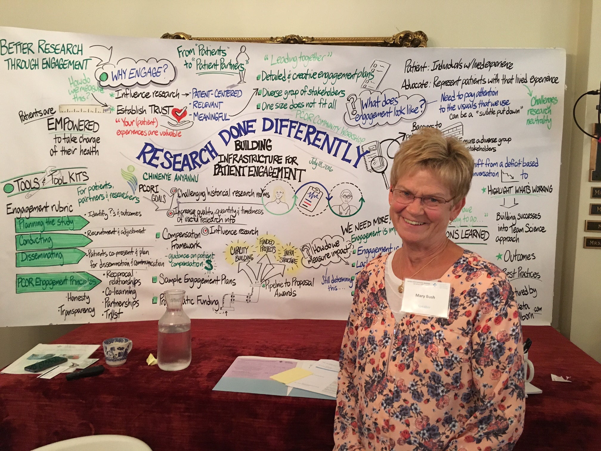 Mary Bush, a patient investigator, stands in front of a visual depiction of a discussion she participated in about patient engagement in research. (Photo credit: Susan Brandzel)