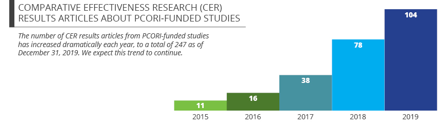 In addition to these reports and summaries, PCORI-funded researchers are also publishing in peer-reviewed journals. As of December 2019, nearly 250 PCORI-funded projects had published comparative clinical effectiveness research (CER) results, up from 200 just three months earlier. As PCORI’s relatively young research portfolio continues to mature, the number of publications will increase rapidly.