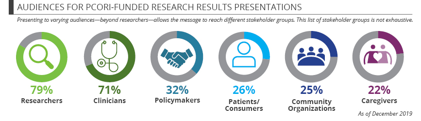 In addition to publishing their findings in prominent journals, our awardees have given more than 5,000 presentations, including invited talks, peer-reviewed presentations, webinars, and more. Nearly two-thirds of our funded projects’ researchers have given at least one presentation so far, with more than 40 percent including a patient or another stakeholder partner as a presenter. This serves to both humanize the research and explain how it is patient centered. Our researchers have presented to diverse audiences, which means they are reaching far beyond the traditional research community (see graphic).