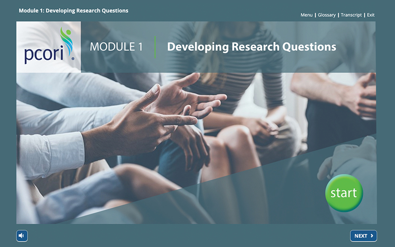 The training includes helpful resources that provide an overview of patient-centered outcomes research and engagement, as well as learning modules that take users through the research cycle from beginning to end. An interactive PDF introduces users to patient-centered outcomes research (PCOR) and explains what makes it different from traditional healthcare research. A video-based module features researchers and patient and stakeholder partners describing the challenges and rewards of engagement. Learning modules cover topics such as Developing Research Questions; Designing the Research Study; Planning Patient-Centered Consent and Study Protocols; Sampling, Recruiting, and Retaining Study Participants; and Understanding and Sharing Research Findings.