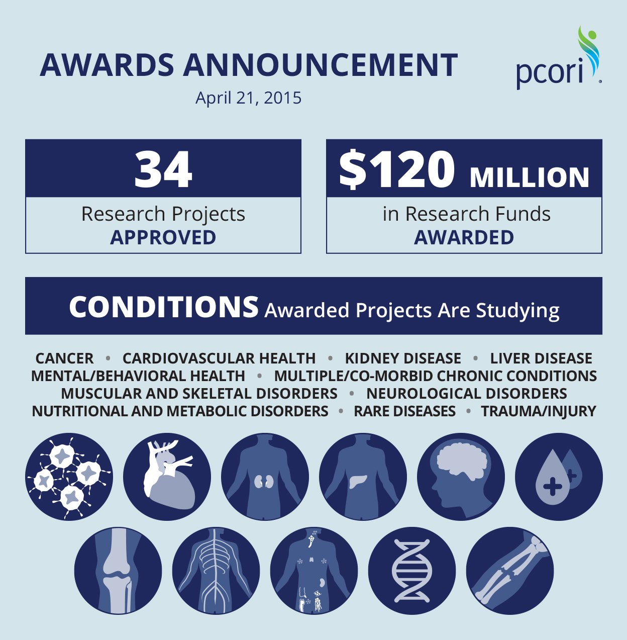 The Board also approved 29 other awards, totaling nearly $61.6 million, under broad funding announcements issued in August 2014 under PCORI’s five National Priorities for Research. These studies will compare different options for improving outcomes for conditions such as opioid addiction, arthritis, stroke, Parkinson's disease, leukemia, chronic kidney disease, and child abuse.