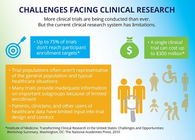 Studies—especially large clinical trials—are currently very expensive and very slow in both setup and conduct. Often, completed studies are not large enough or designed properly to answer the questions most critical to patients. Research teams don’t involve patients who are representative of important population groups. Or studies don’t yield results that can be usefully applied in typical healthcare settings. And many simply fail to answer the practical questions that patients and clinicians face every day.