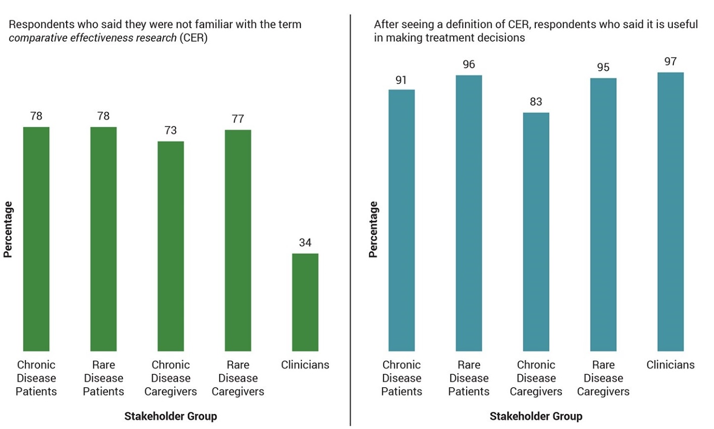 We learned from these surveys that patients, caregivers, and clinicians are enthusiastic about the potential of patient-guided CER. More than 90 percent of the patients, clinicians, and caregivers for patients with rare conditions—and more than 80 percent of caregivers for patients with chronic conditions—reported that they believe CER is useful for making treatment decisions.