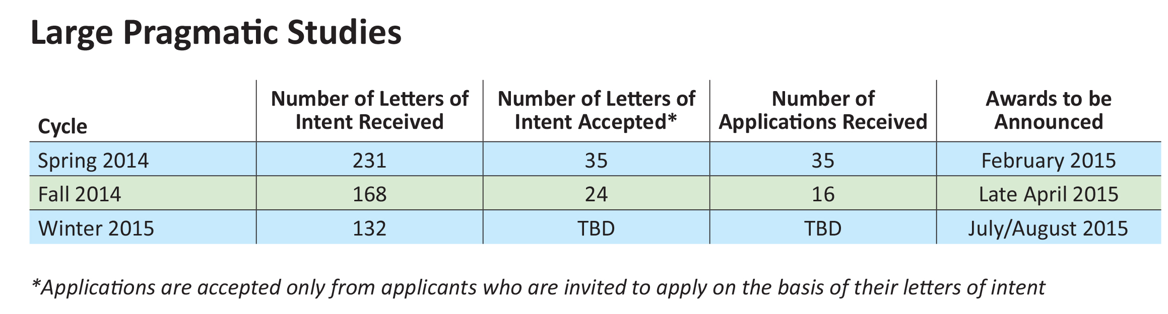 Our Large Pragmatic Studies to Evaluate Patient-Centered Outcomes initiative, launched in early 2014, is our process for funding pragmatic clinical trials, large simple trials, and large-scale observational studies comparing two or more options for addressing a major health problem. We plan to expand this promising program and are looking forward to announcing the first round of awardees in early 2015.