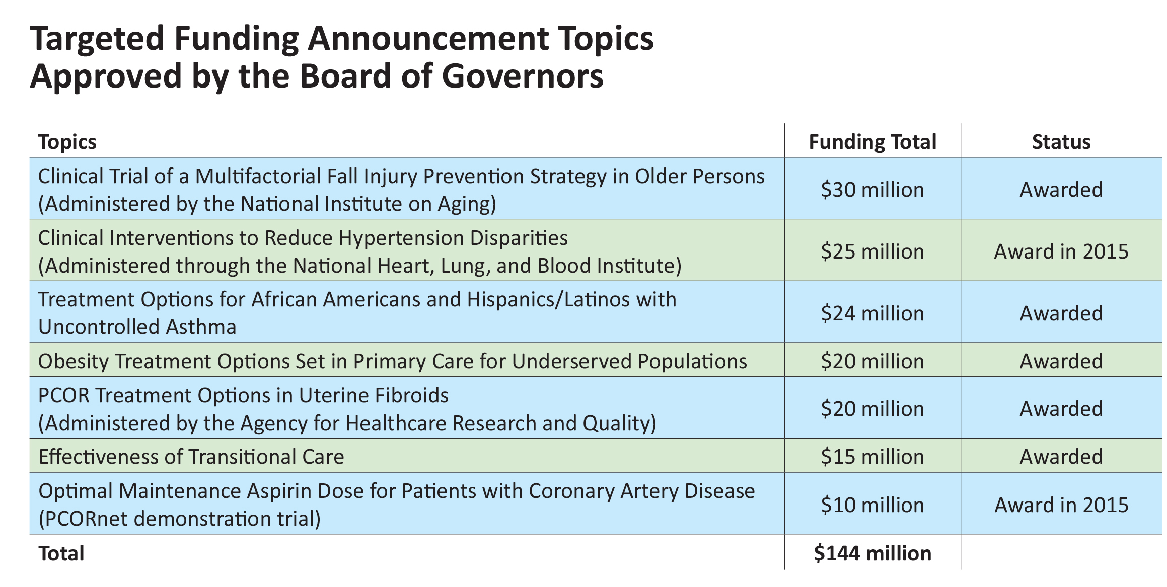 In 2013, we started issuing “targeted” funding announcements, which seek research proposals on the single, highest-priority questions identified through our topic generation and research prioritization process. To date, we’ve funded seven targeted announcements totaling $144 million in funding, including three administered by the National institutes of Health or AHRQ and our first pilot study under PCORnet, our National Patient-Centered Clinical Research Network (see below). Other targeted topics in our pipeline include one just approved by our Board—diagnosis and treatment of hepatitis C virus infection.